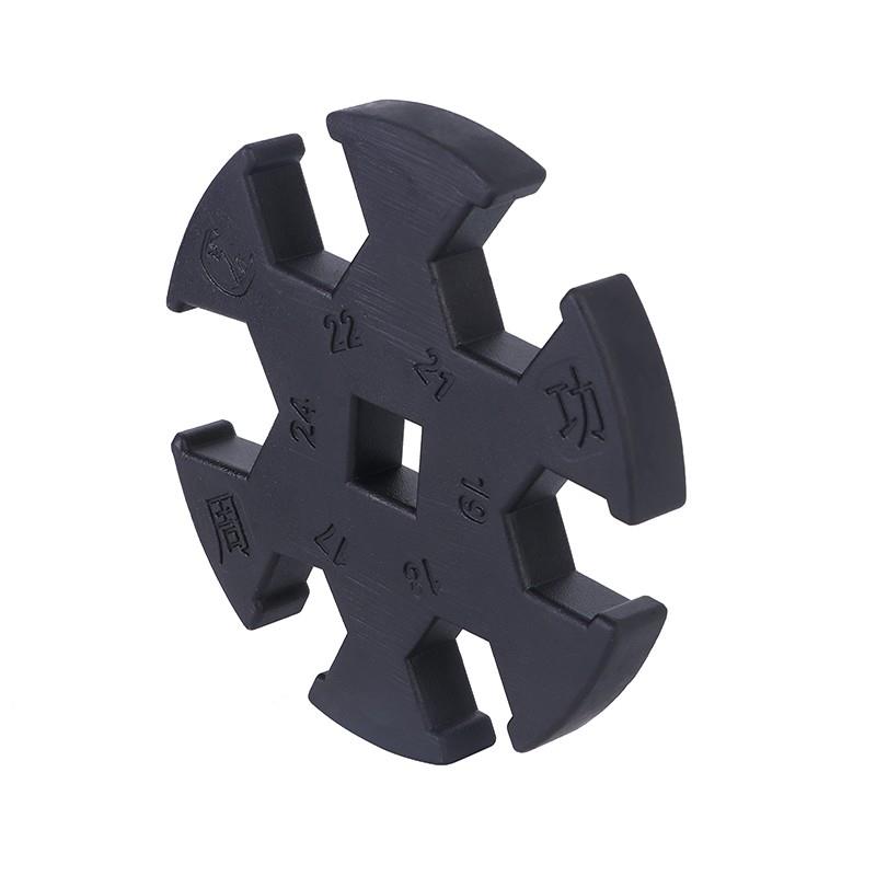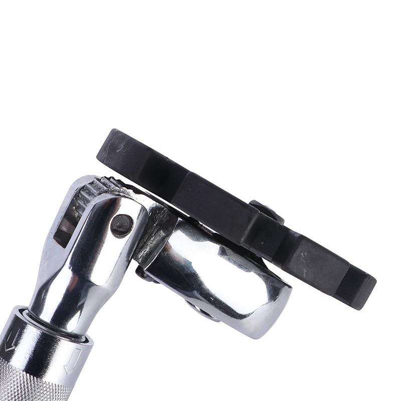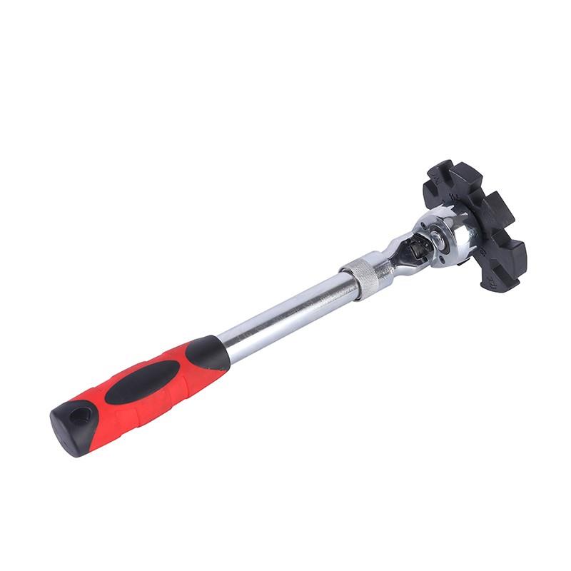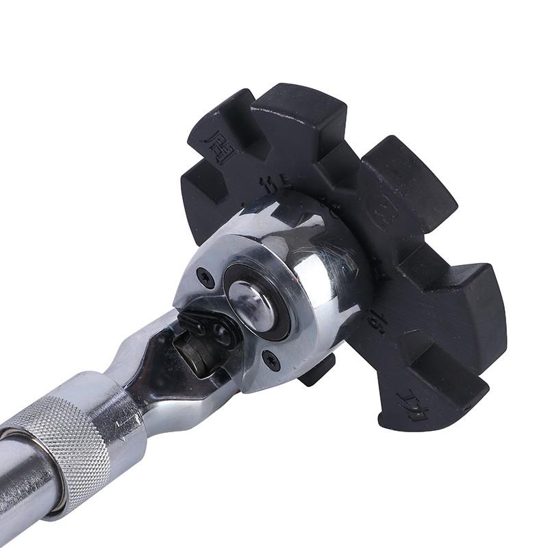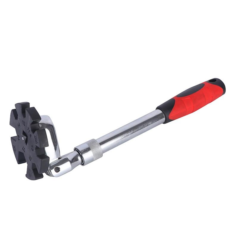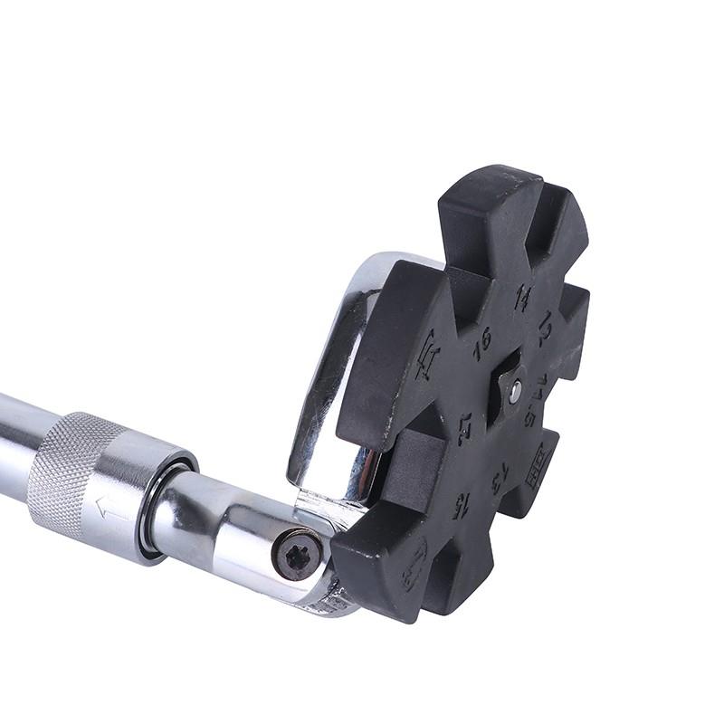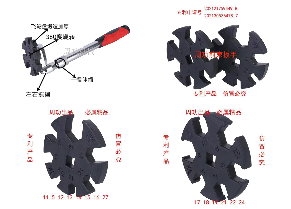 做四輪定位用的開口扳手很容易會(huì)開口,滑落傷到技師的手,而且新手用多大的扳手也不知道,拿一個(gè)扳手拿錯(cuò)了好幾次,開口扳手在狹小的空間又很難用上力,所以我們做了一個(gè)倒鉤槽防滑落、再加360度旋轉(zhuǎn)和90度左右搖擺、不滑落又能用上力,只要一把扳手難拆銹死的前束螺絲就迎刃而解了。